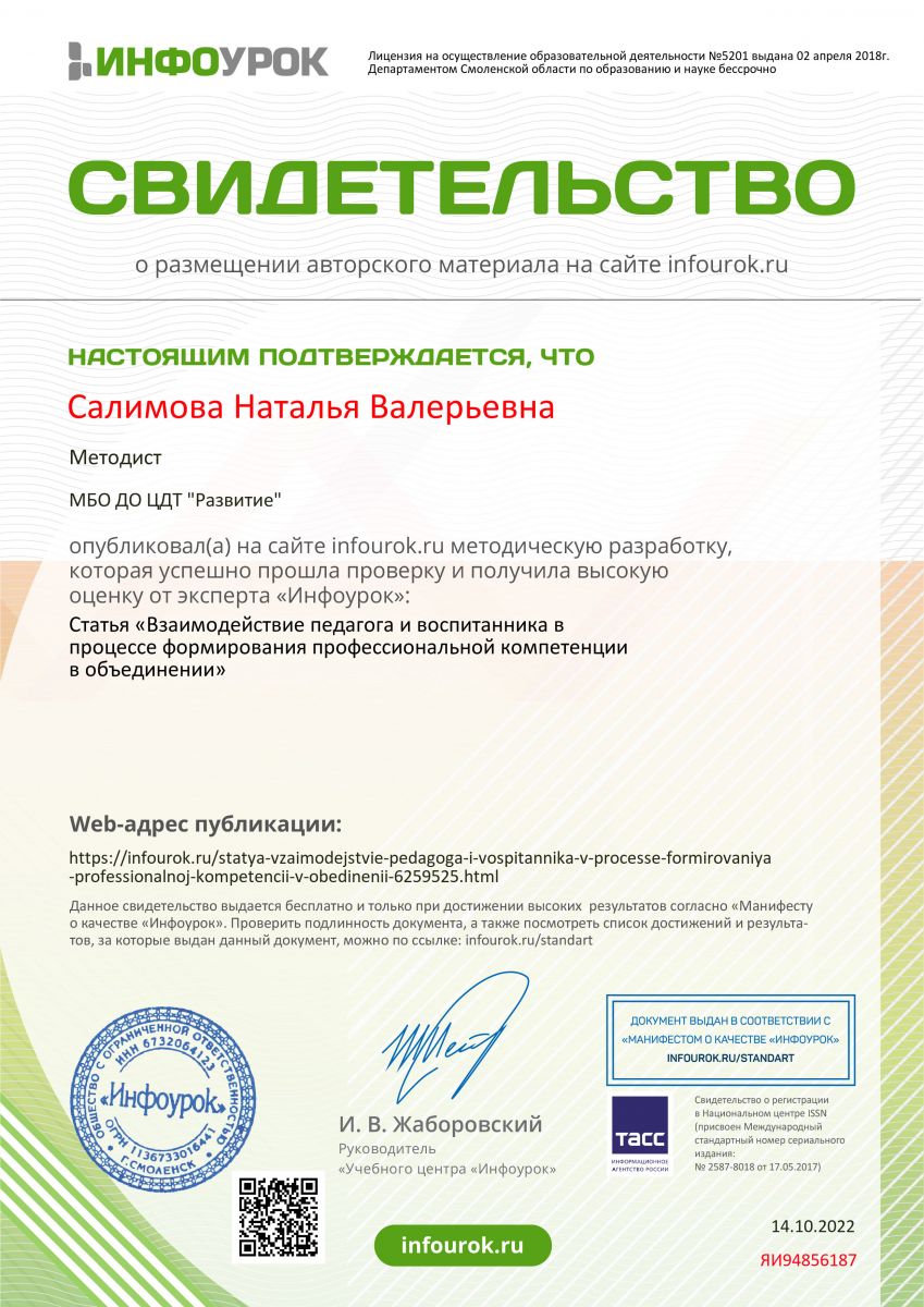 Свидетельство о размещении авторского материала на сайте infourok.ru, педагог Салимова Н.В.