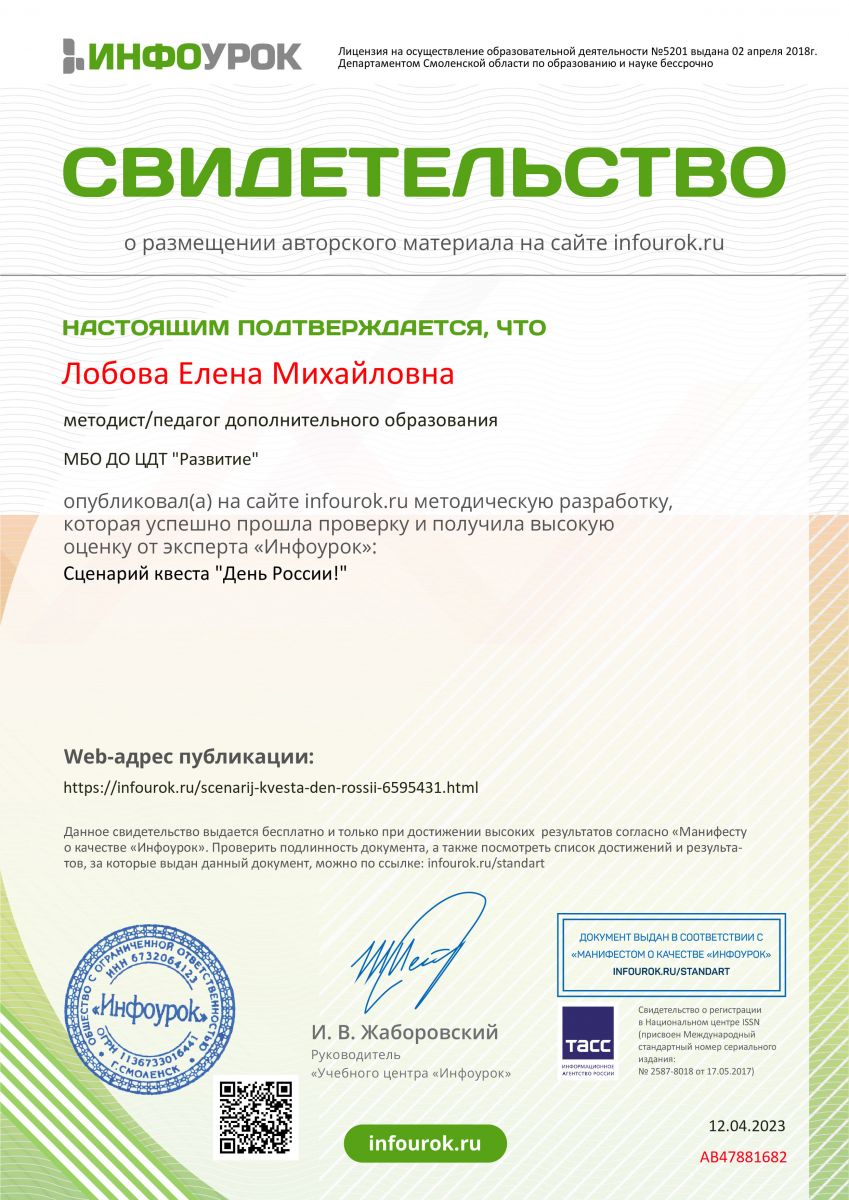 Свидетельство о размещении авторского материала на сайте infourok.ru, педагог Лобова Е.М.