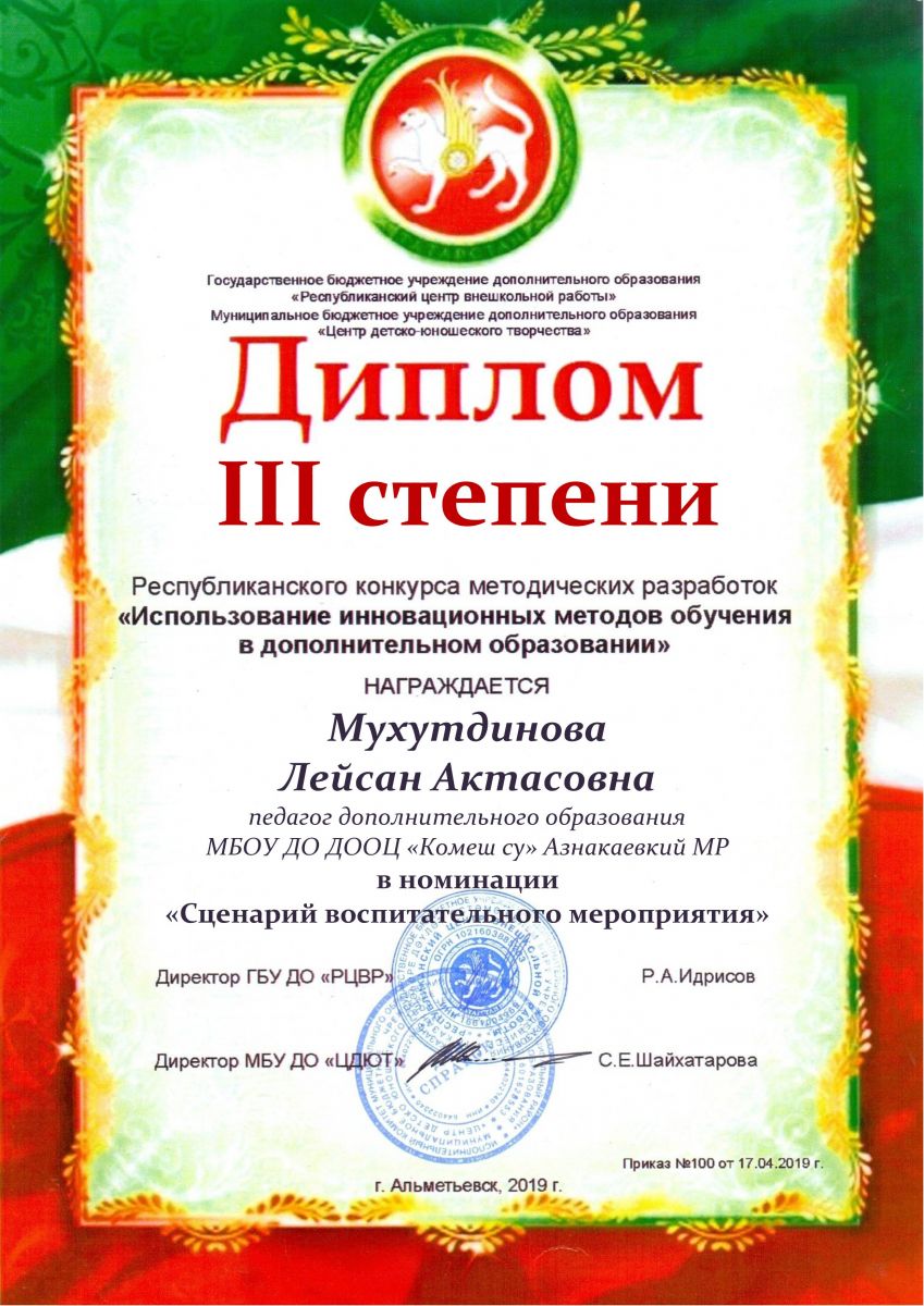 III место - Мухутдинова Лейсан Актасовна, педагог дополнительного образования МБОУ ДО ДООЦ «Комеш су»