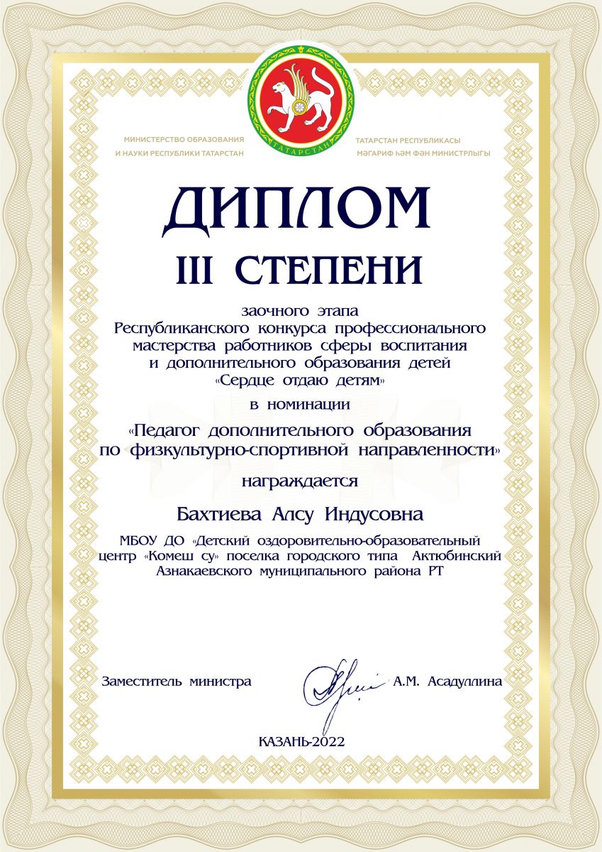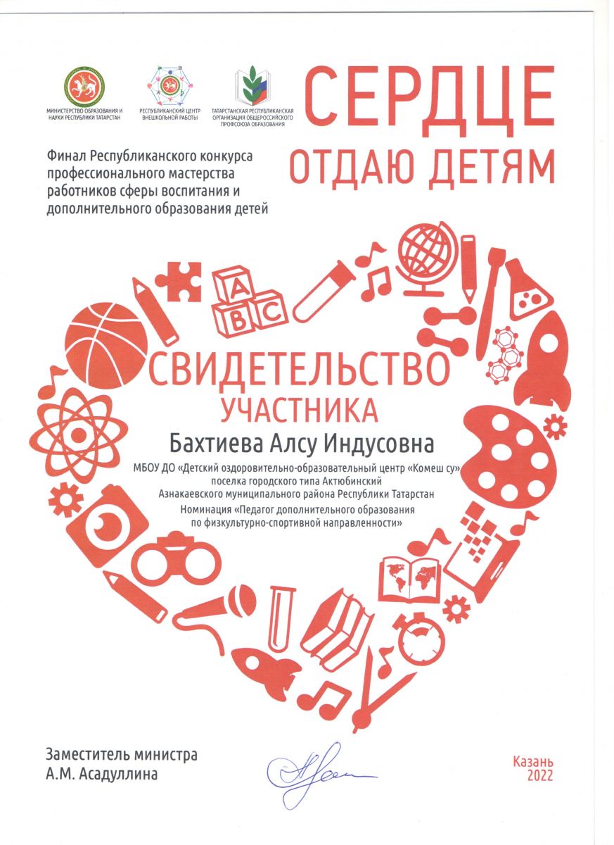 Свидетельство участника финала республиканского конкурса "Сердце отдаю детям", Бахтиева А.И., 2022г.