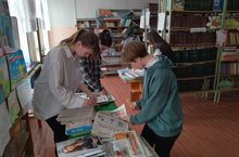Ребята из группы "Актив библиотеки" проводят подшивку периодических изданий в библиотеке. Они знают, как сделать мир лучше, интереснее.