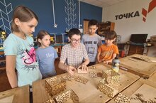 Работа площадки "Лазерная резка" в рамках проекта "Территория добрых перемен". Волонтёры отряда "Открытые сердца" проводят практические занятия для целевой группы проекта.