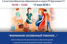 Министерство образования и науки Республики Татарстан совместно с Общественным советом при Министерстве образования и науки Республики Татарстан 17 мая 2018 года проводит на базе Казанского инновационного университета имени В.Г. Тимирясова шестое заседание Республиканского родительского интернет – собрания по теме «Внимание! Особенный ребенок…» Начало мероприятия в 10.30час.
