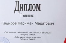 С гордостью и уважением поздравляем Рахманову Назилю (учитель Сабирова Х.Г.) с заслуженной наградой. Только смелый и уверенный в себе человек мог добиться такого успеха. Желаем с таким же упорством идти дальше к новым победам.