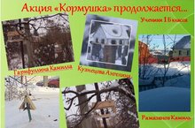 В Акции «Кормушки» активно принимают участие ученики 1Б класса под руководством классного руководителя Бикмухаметовой Н.Х. Особенно выделились учащиеся Атласов Илья, Кузнецова Ангелина, Абрамов Даниил, Рамазанов Камиль, Гарифуллина Камилла. Они каждый день приносят еду для птиц и кормят их, заботятся о них.