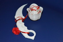 Изделие выполнено на 3D принтере. Для украшения использована текстильная красная ленточка, связывающая 2 модели в одну композицию, и текстильная красная розочка - символ горячей и благородной любви рыцаря XXI века к своей даме сердца. Белый цвет 3D моделей олицетворяет чистое сердце рыцаря, в котором в одном ритме живут нежность - в образе белой 3D розы, и готовность к защите чести близких - в образе белого 3D кинжала. Рыцарю XXI века, как и рыцарю XIV столетия, присущи смелость, отвага, мужество, он - образован, умён, любим. Но сейчас у него гораздо больше возможностей удивить даму сердца - например, вместе с настоящей розой подарить 3D розу с высеченной на ней клятвой о вечной любви.