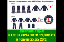 Швейная фабрика БРОССКО вновь принимает заказы на пошив формы. С 1 марта по 30 марта 2014 года, в случае внесения предоплаты, действует скидка 20%. Данная информация может заинтересовать родителей будущих первоклассников и тех учащихся, которым планируют заменить или докупить форму на будущий учебный год. В разделах "Доска объявлений" и "Родителям" вы можете ознакомиться с прейскурантом цен, моделями формы, подробной информацией о скидках.