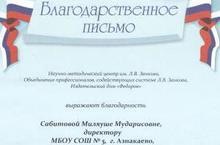 Научно-методический центр им. Л.В.Занкова, Объединение профессионалов, содействующих системе Л.В.Занкова, Издательский дом «Федоров» выразили благодарность Сабитовой Миляуше Мударисовне, директору МБОУ СОШ №5 г. Азнакаево, за творческий труд, увлеченность, готовность к новому поиску, поддержку передовых идей системы развивающего обучения Л.В.Занкова и за активное участие педагогов школы во Всероссийском конкурсе «Вернисаж занковцев»