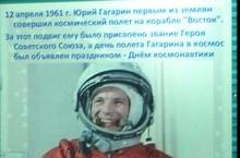 Стало хорошей традицией 12 апреля во всех классах школы проводить классный час посвящённый исследованию космоса. Лекторская группа старшеклассников - учащиеся 11 «А», 11 «Б» и 10 «А» классов сегодня подготовили беседы, викторины, конкурсы, презентации и видеоролики о космосе и его исследовании.
