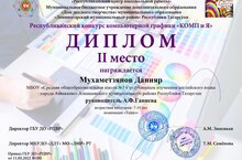 Поздравлям Мухаметзянова Данияра со 2 местом в республиканском конкурсе компьютерной графики "КОМПиЯ" в номинации "Техно". Молодец!