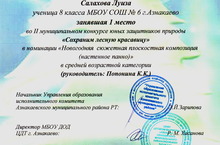 1 место - Салахова Луиза (8А класс), номинация: "Новогодняя сюжетная плоскостная композиция (настенное панно)" в средней возрастной категории (руководитель: Попонна К. К.);