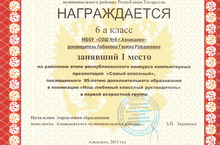 1 место - коллектив 6А класса (руководитель: Лобанова Г. Р.), муниципальный этап республиканского конкурса компьтерных презентаций "Самый классный!", посвящённый 95-летию дополнительного образования, в номинации "Наш любимый классный руководитель";