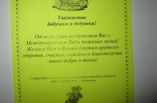 С 30.09 – 01.10.13 тимуровцы 5Б и 7Б классов провели в микрорайоне нашей школы акцию «Поздравь пожилых», посвящённую Международному Дню пожилых людей. На остановках, магазинах ребята расклеили поздравительные телеграммы.