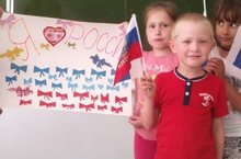 "Родничок" мәктәп яны лагерының иң кечкенә тәрбияләнүчеләре (1 нче отряд: 6-8 ел) Россия көненә плакат ясадылар