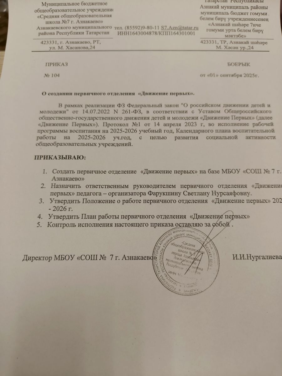 Приказ №104 от 01.09.2025 г. "О создании первичного отделение "Движение первых"