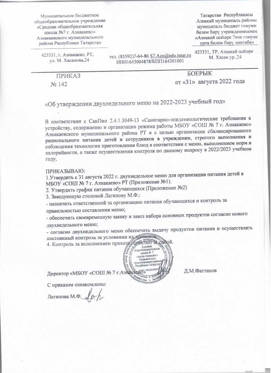 Приказ №142 от 31.08.2022 г. Об утверждении двухнедельного меню