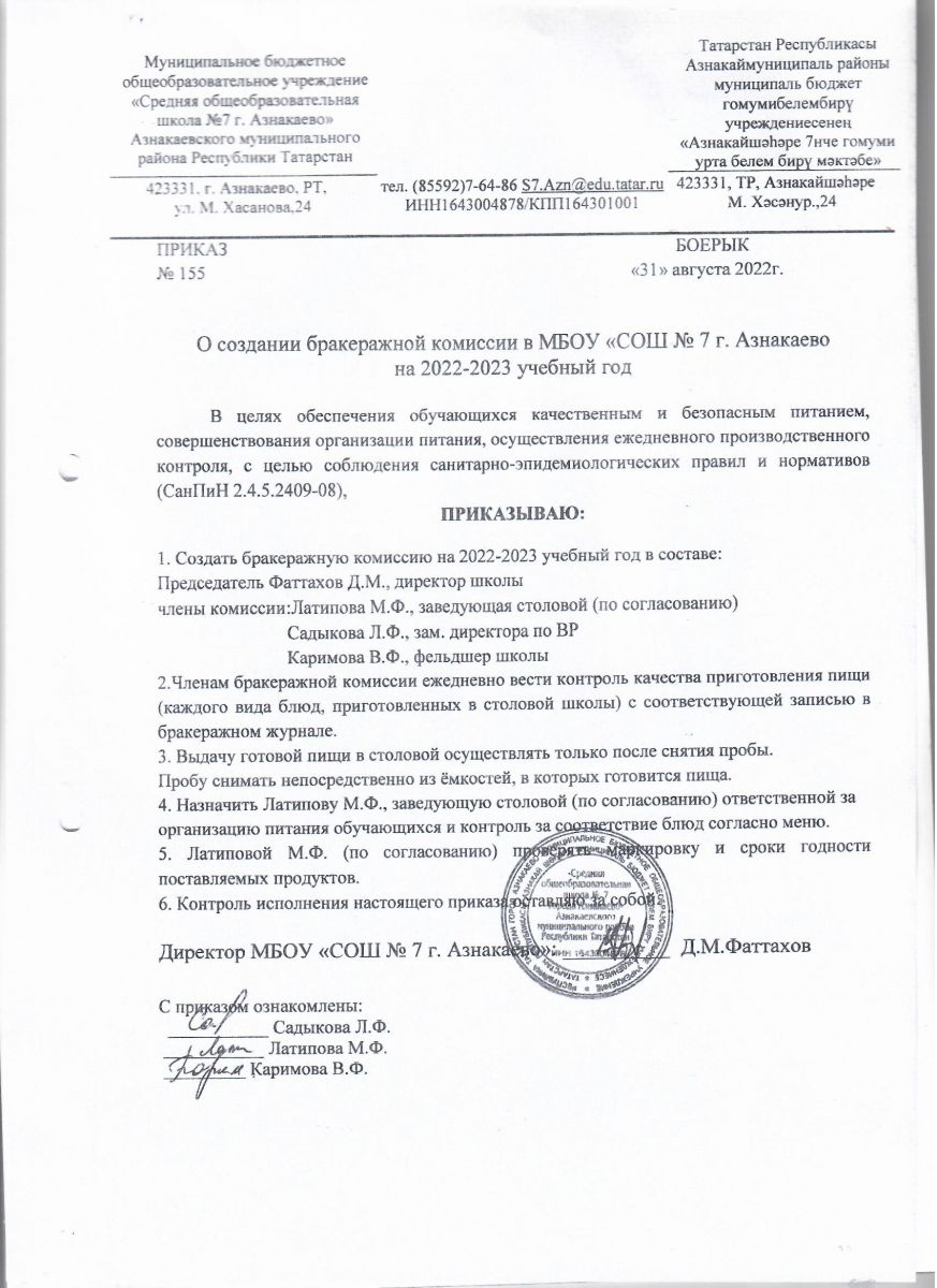 Приказ №155 от 31.08.2022 г. О создании бракеражной комиссии