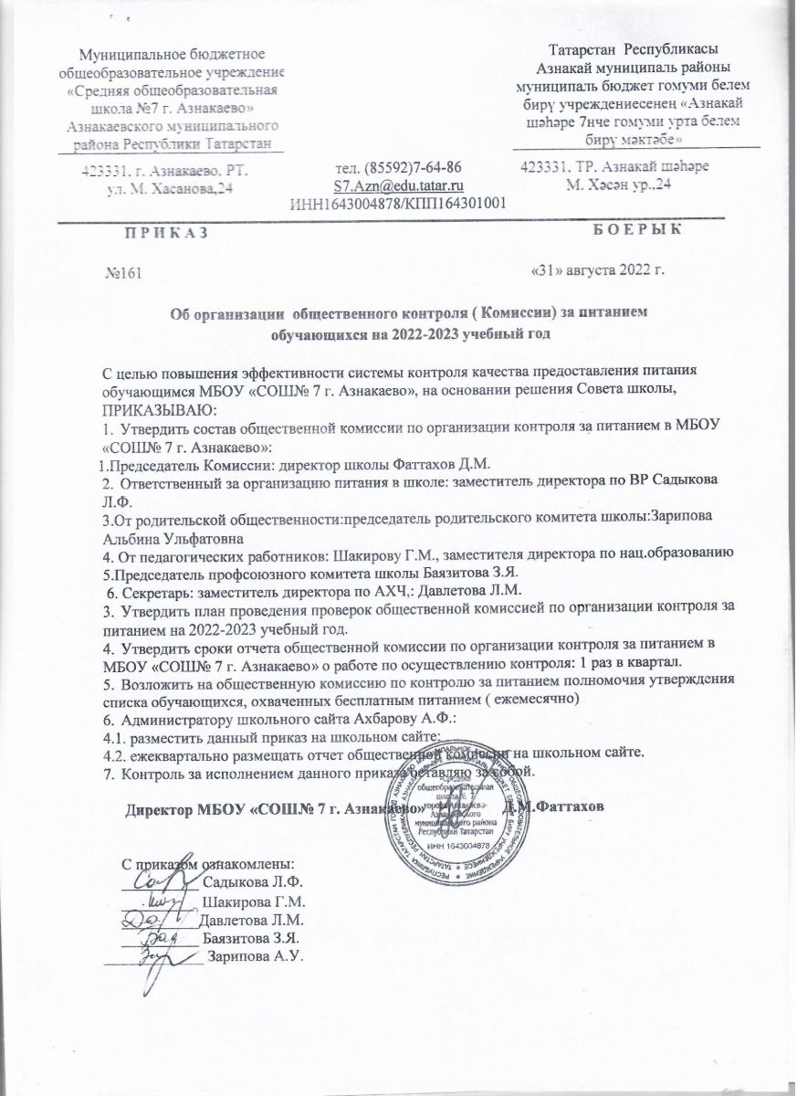 Приказ № 161 от 31.08.2022 г. Об организации общественного контроля за питанием