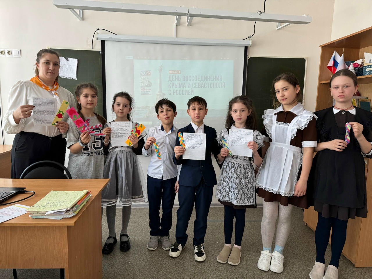 Быел безнең ил үзенчәлекле датаны – Кырымның Россия белән кушылуының 12 еллыгын, яңа тарихтагы мөһим вакыйганы билгеләп үтә. Әлеге вакыйга уңаеннан, тәрбия буенча директор киңәшчесе 4 класс укучылары белән берлектә искиткеч акция үткәрде. Балалар энтузиазм белән Кырымнан яшьтәшләренә хатлар яздылар һәм уникаль китап кыстыргычлары булдырдылар. Нигез салуларның дизайнына аерым игътибар бирелде: аларда мәдәни мирасның байлыгын чагылдырып, татар һәм Кырым-татар орнаментлары элементлары гармонияле рәвештә бергә кушыла. Һәр укучы үзенең кыстыргычын ясады, ул хәзер конвертта хат белән бергә Кырымнан балаларны шатландыру өчен җибәреләчәк.