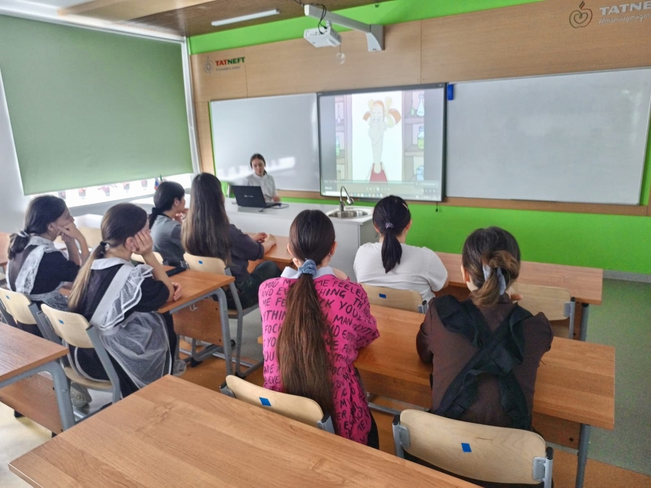 В школе в рамках проекта "Школьная медицина" медицинская сестра ФАП Ахметшина Рания Кашифовна провела профилактическую беседу с девочками\ Мәктәптә "мәктәп медицинасы" проекты кысаларында ФАП шәфкать туташы Әхмәтшина Рания Кәшиф кызы кызлар белән профилактик әңгәмә үткәрде