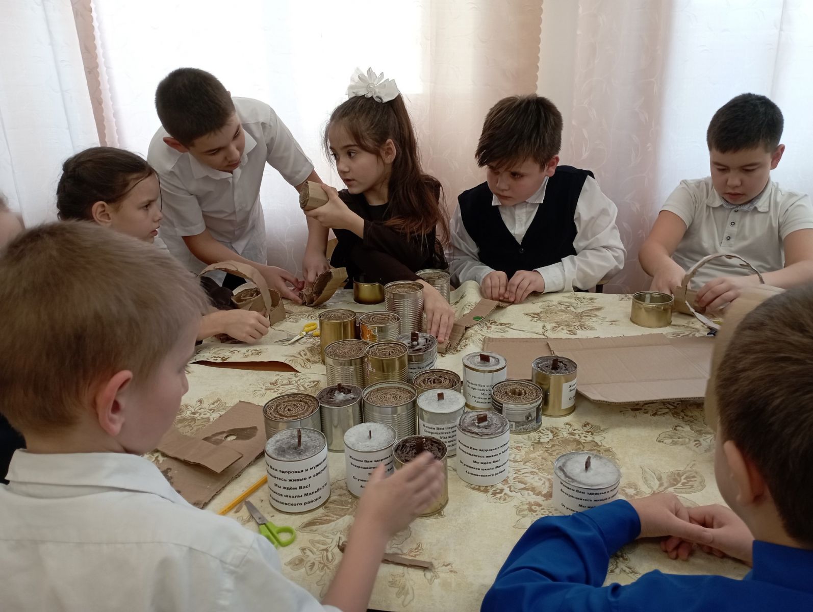 Под руководством классного руководителя Сулеймановой Л.Т. и Заготовой Л.А школьники 2,4 класса сделали блиндажные свечи для наших солдат.