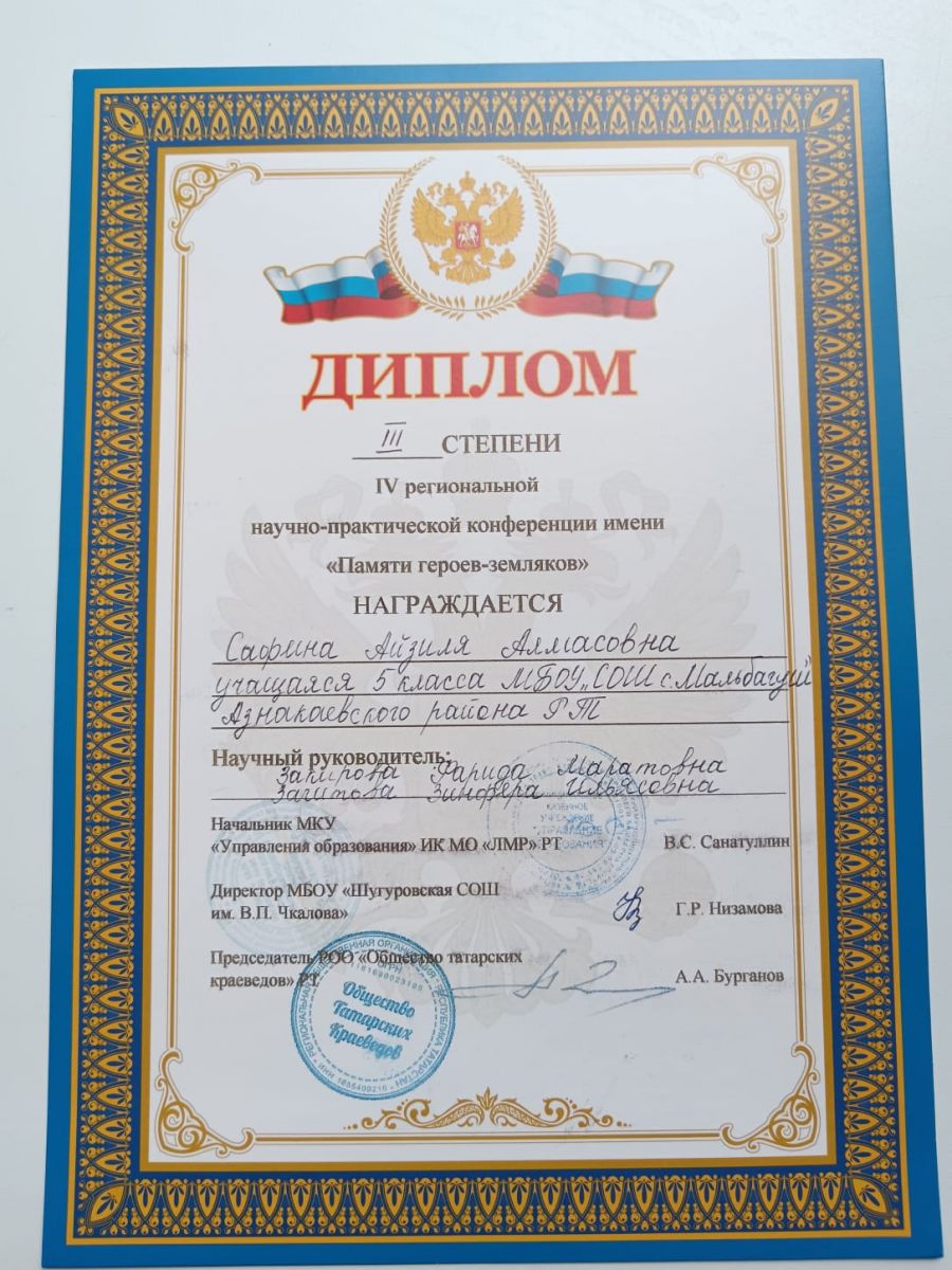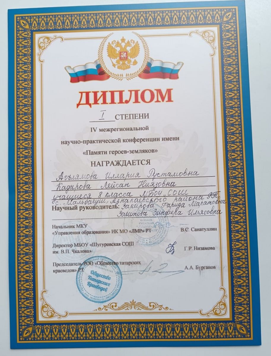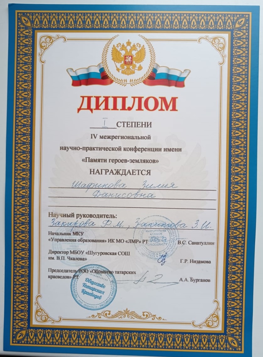 Наши ученики участвовали в IV межрегиональной научно-практической конференции имени Памяти пяти героев-земляков «Духовное и историческое наследие родного края» («Туган ягыбызның рухи һәм мәдәни мирасы») для учащихся и педагогов общеобразовательных учреждений на базе МБОУ «Шугуровская СОШ им. В.П. Чкалова».