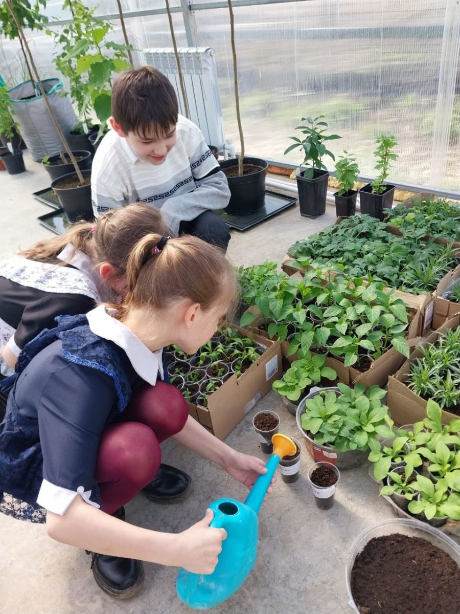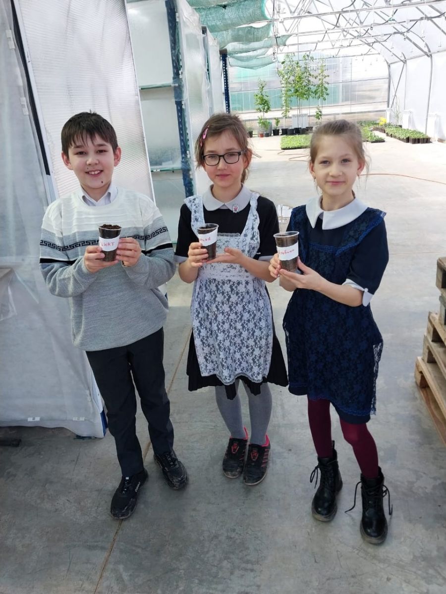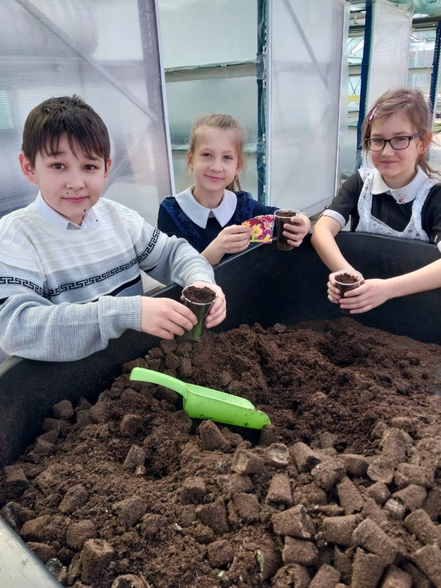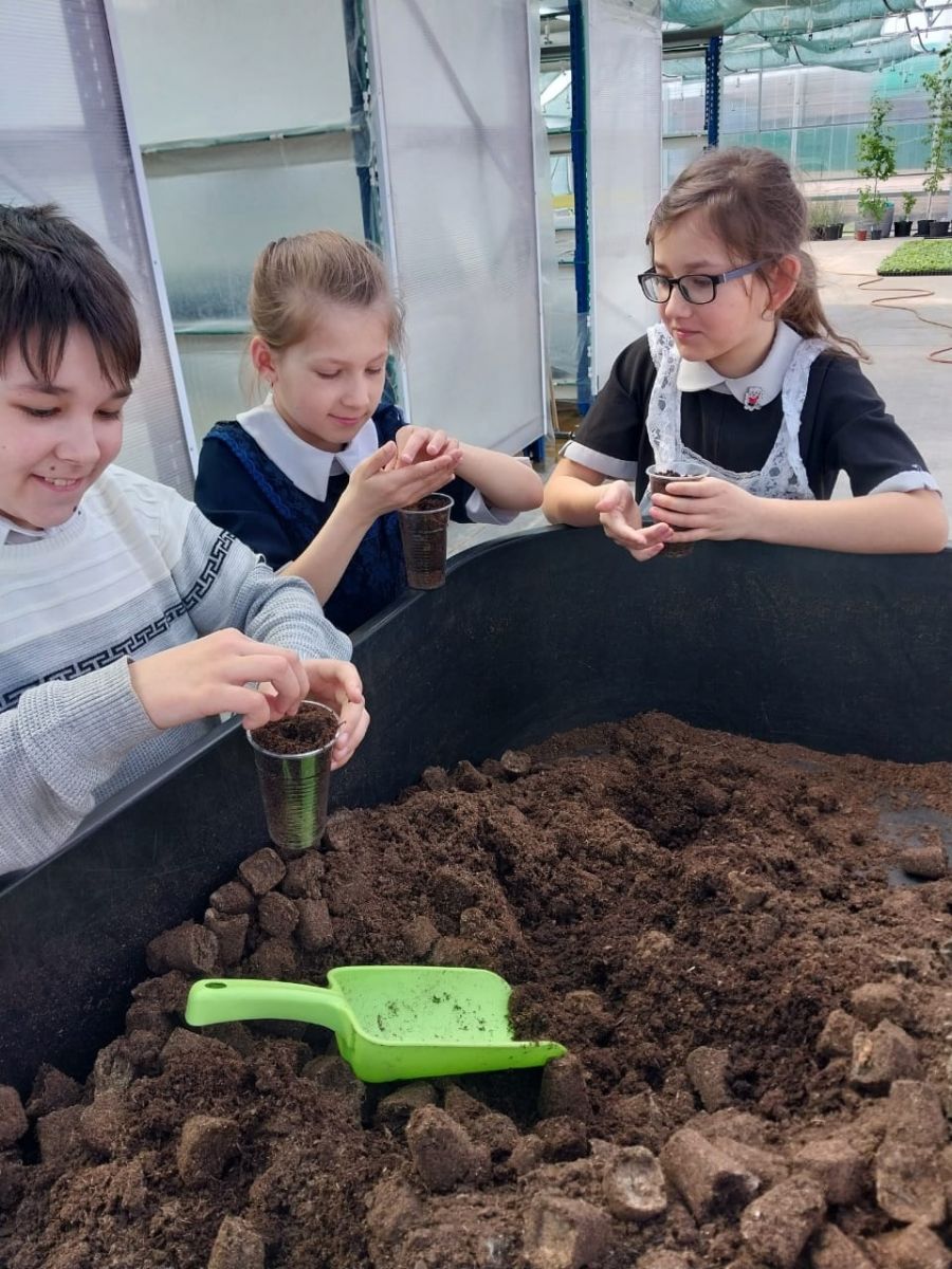 Ученики 3 класса посадили в школьной теплице саженцы цветов.