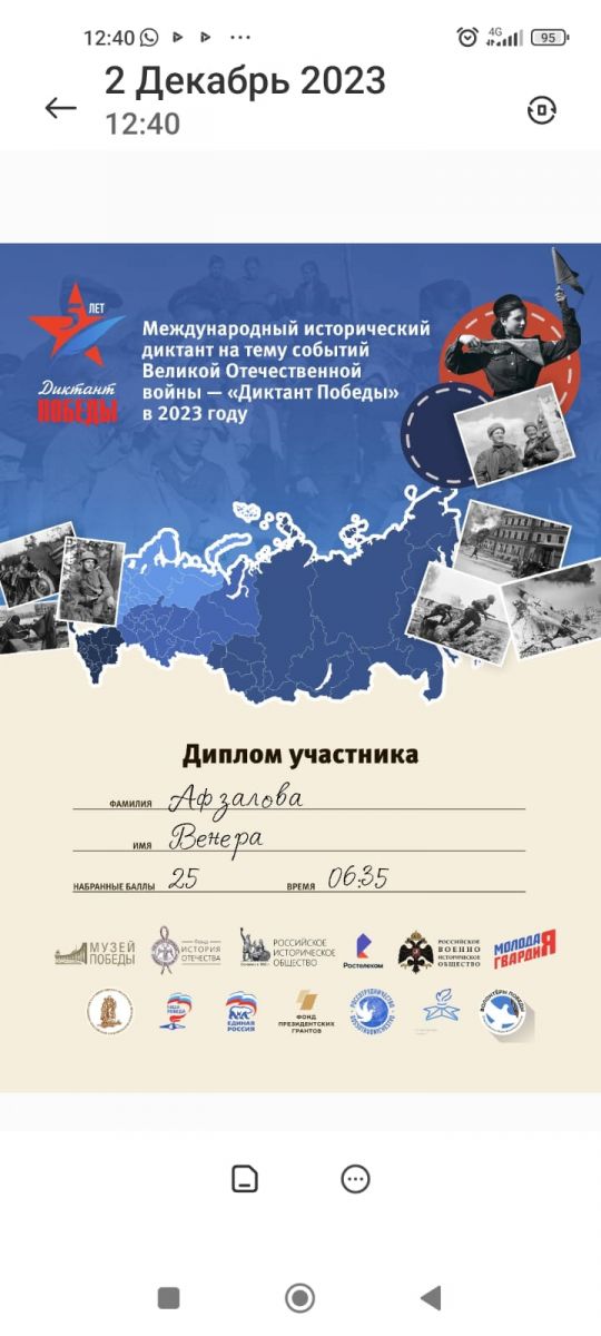 Бүген безнең мәктәп «Җиңү диктанты» – Бөек Ватан сугышы вакыйгалары темасына Халыкара тарихи акция үткәрү өчен мәйданчык булды. Җиңү диктанты 25 биремнән тора, шуларның 15е җавап вариантын сайлап һәм 10ы кыскача җавап биреп, тест формасында үткәрелә. Җиңү диктантын язу вакыты 45 минут тәшкил итә.