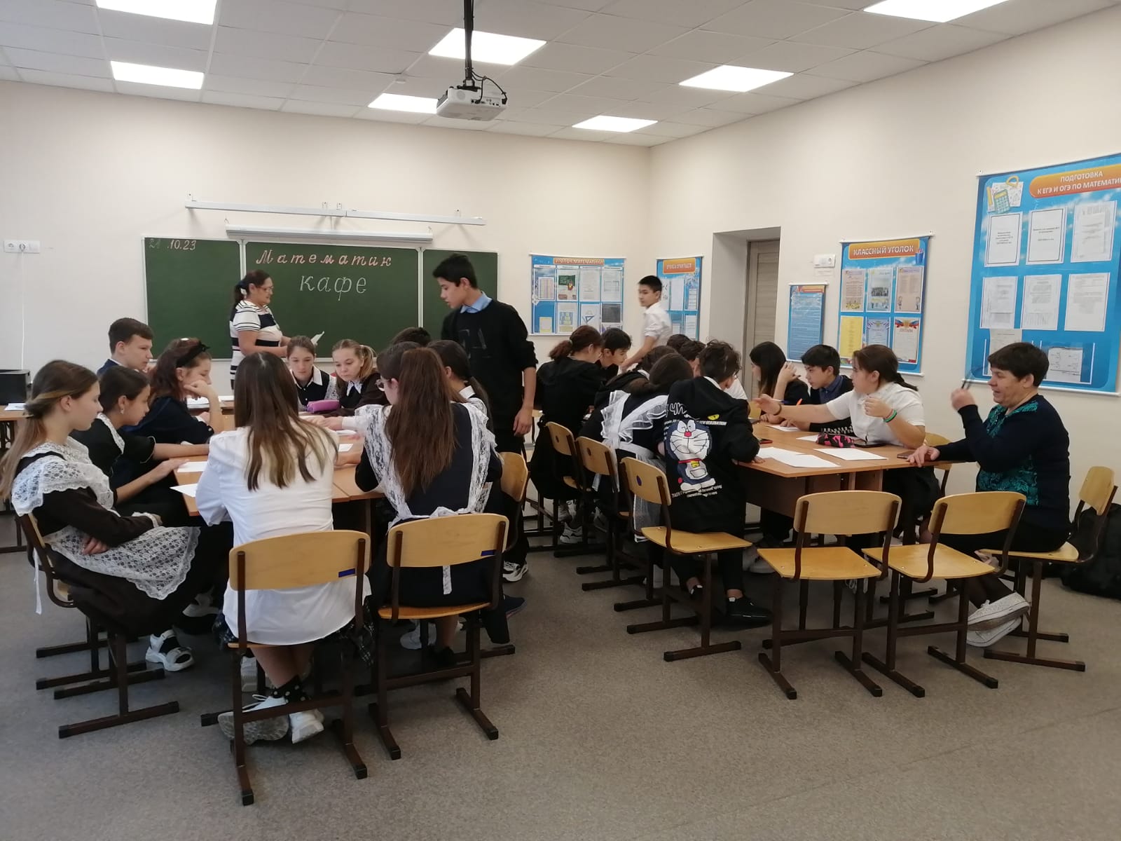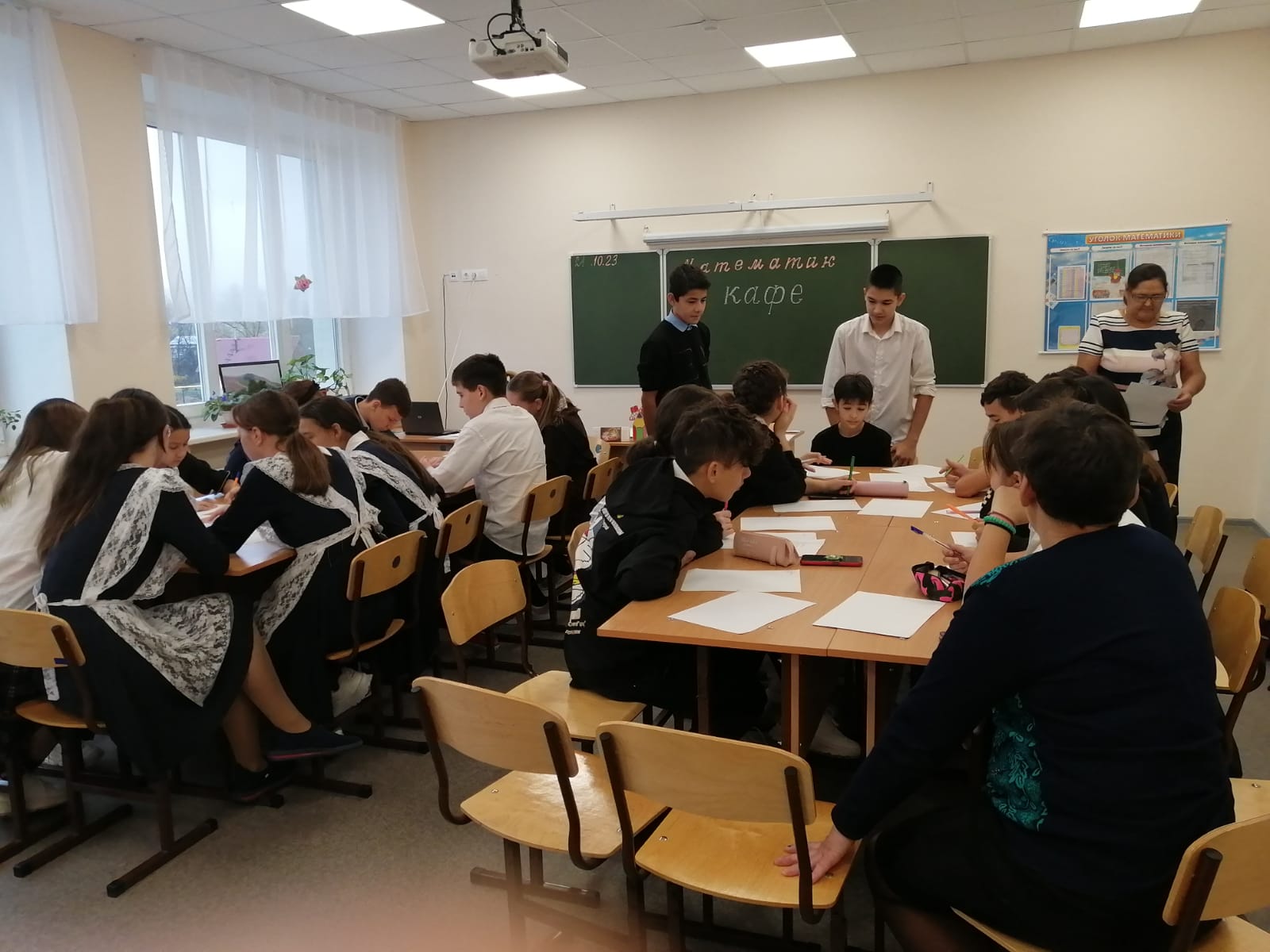 21 октябрьдә математика, информатика атналыгы кысаларында 7, 8,9 сыйныф укучылары «Математика кафесына» «Уйла, сынап кара һәм эзлә" дигән девиз астында дәрескә керделәр. Сыйныфтан тыш дәрес математика белән кызыксынуны стимуллаштыру, логик фикерләүне үстерү, тиз уйлау һәм дөрес карар кабул итү, укучыларның акыллылыгын, игътибарын һәм тапкырлыгын үстерү максатыннан үткәрелде.