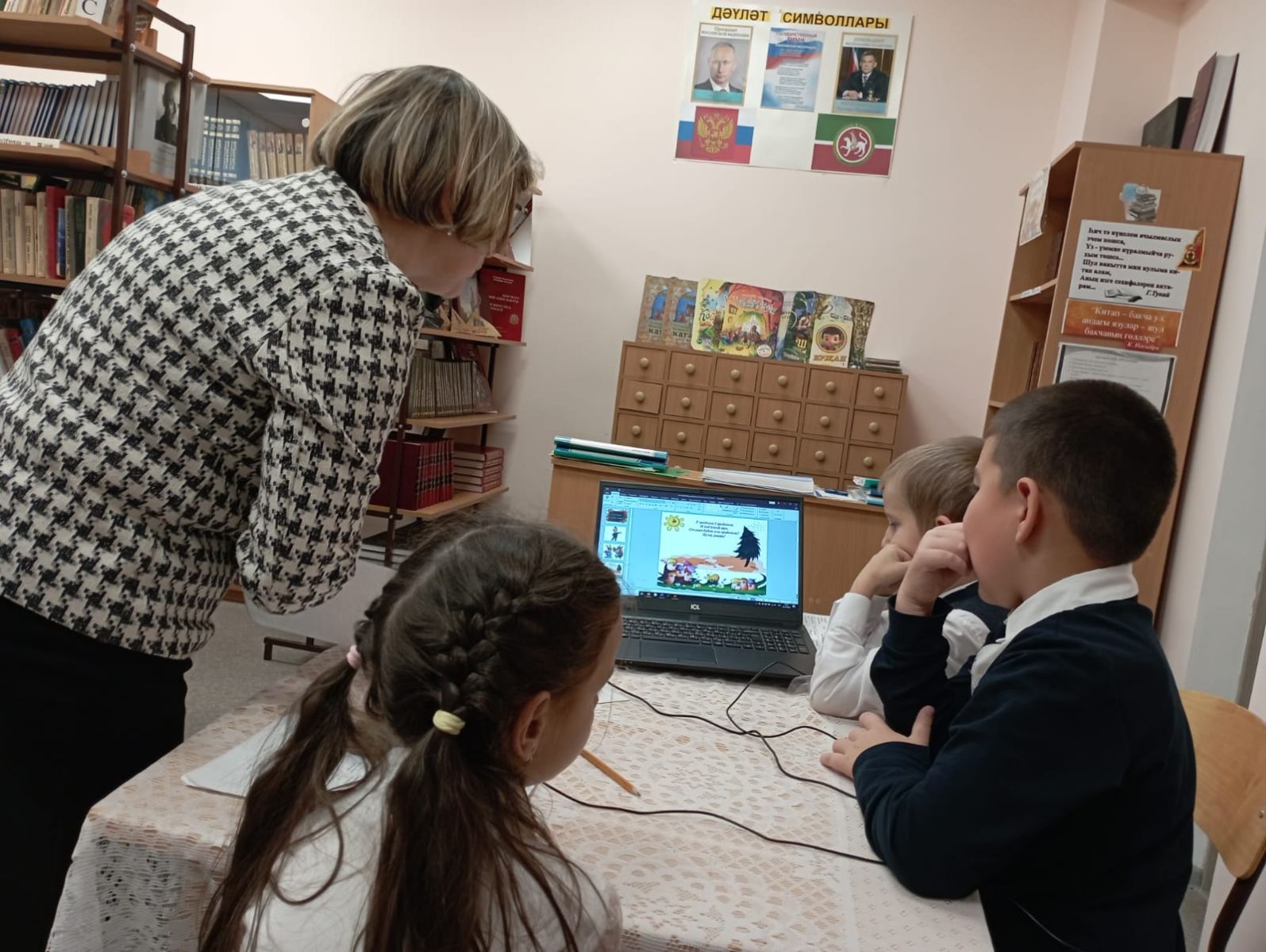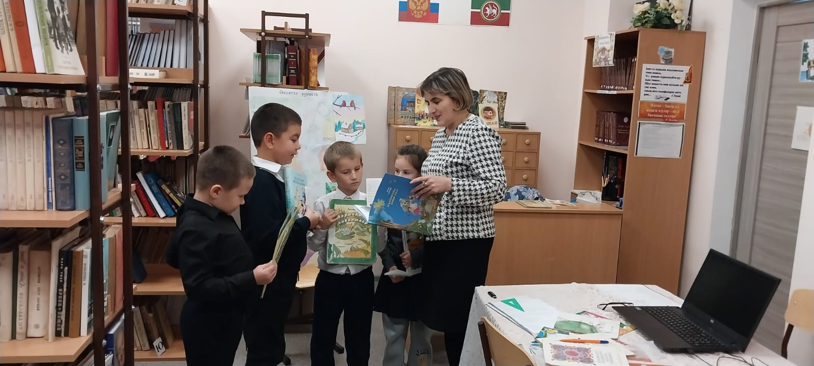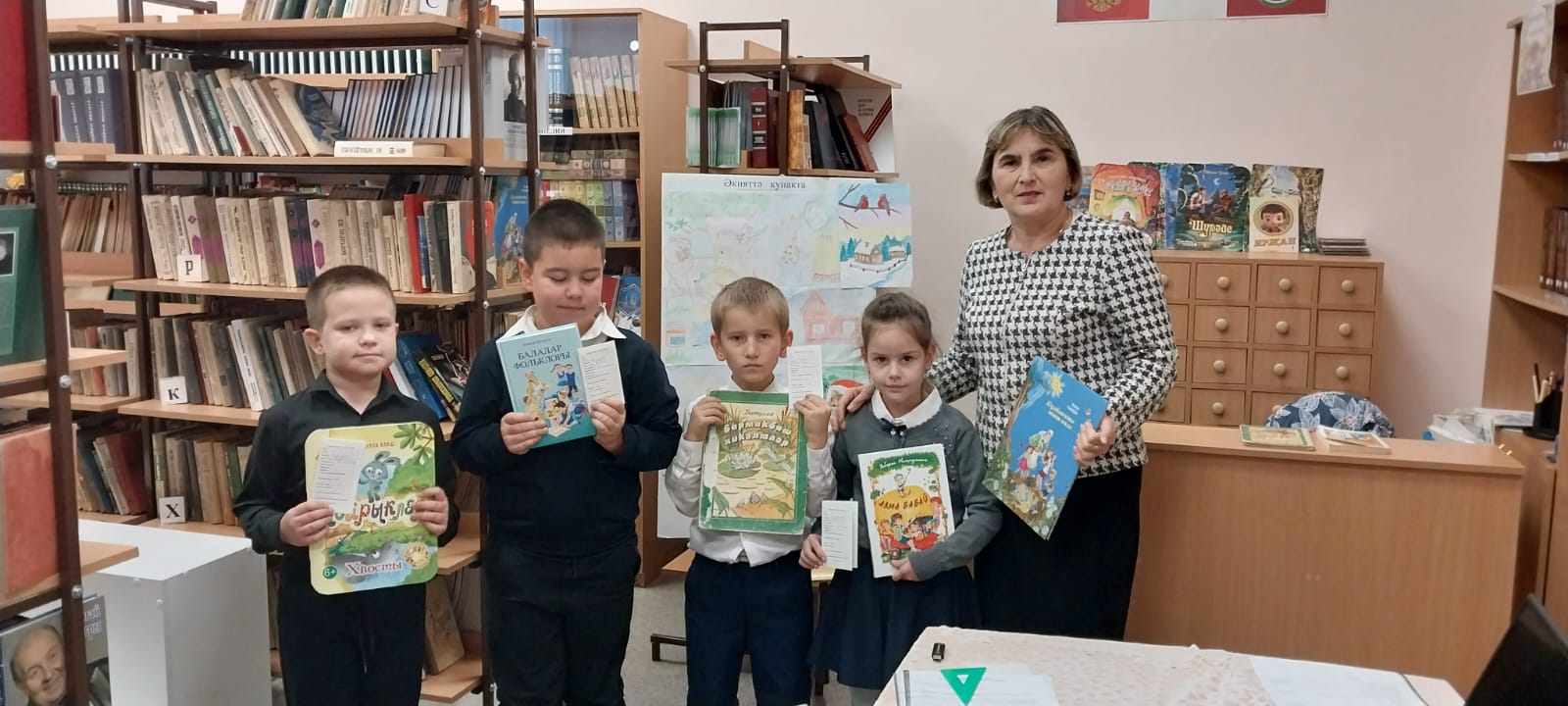 Бүген без балалар белән авыл китапханәсенә бардык. Китапханәдә безне җылы каршы алдылар. Китапханәче китапханә буйлап экскурсия үткәрде. Ул китапларның темалар һәм яшьләр буенча киштәләрдә торуы турында сөйләде. Китапханәдә тематик стендлар күп. Ул китап белән ничек дөрес мөгамәлә итәргә кирәклеге турында сөйләде. Китапханәче язучылар турында сөйләде, балалар өчен журналларның соңгы саннары белән таныштырды.