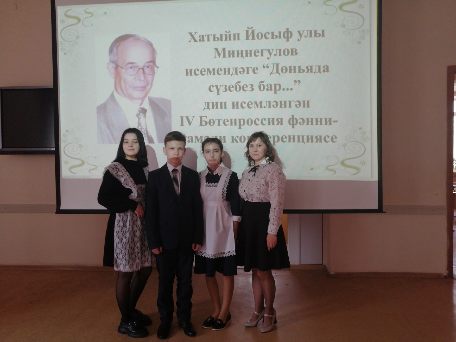 На днях в татарской гимназии № 11 прошла IV Всероссийская научно-практическая конференция имени Хатипа Миннегулова "В мире есть слово". Из нашей школы с победой вернулись Салахова Лилия, Кадырова Лейсан, Ахметшин Ильназ, Вафина Альбина.