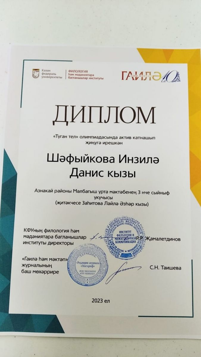 Победитель олимпиады "Туган тел", организованной журналом "Семья и школа"/"Гаилә һәм мәктәп" җурналы оештырган "Туган тел" олимпиадасынын җинүчесе