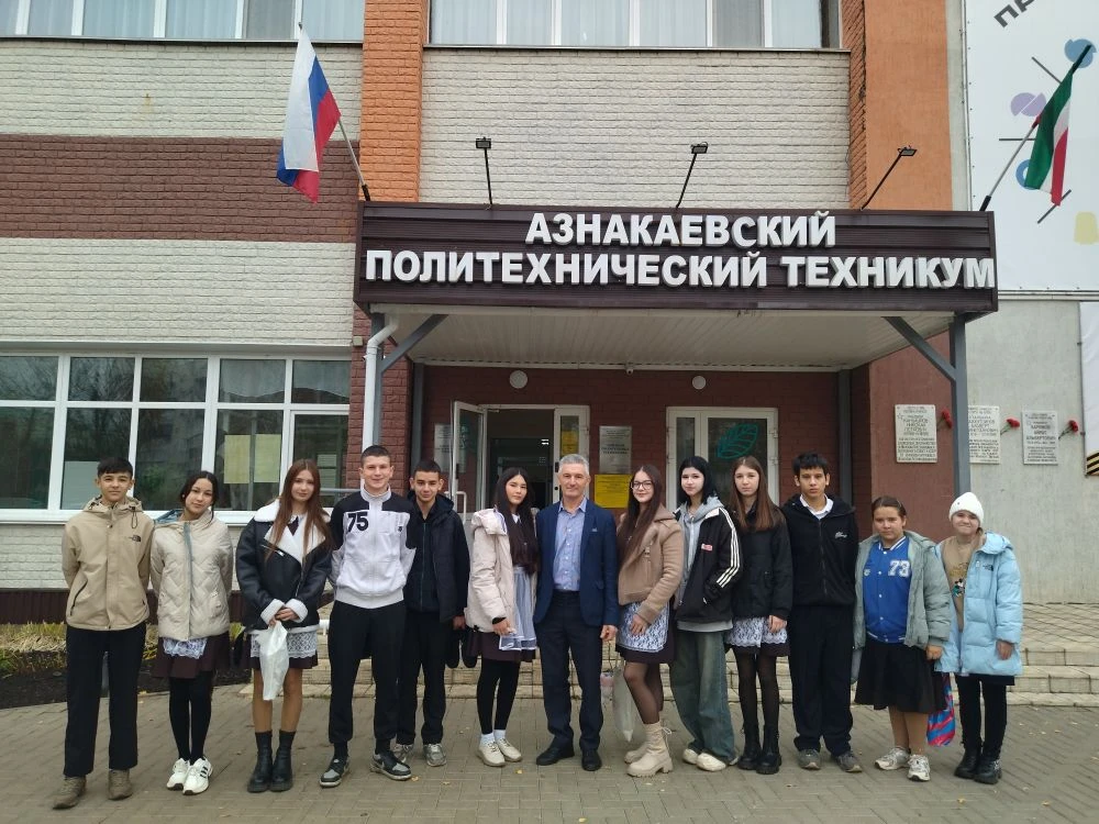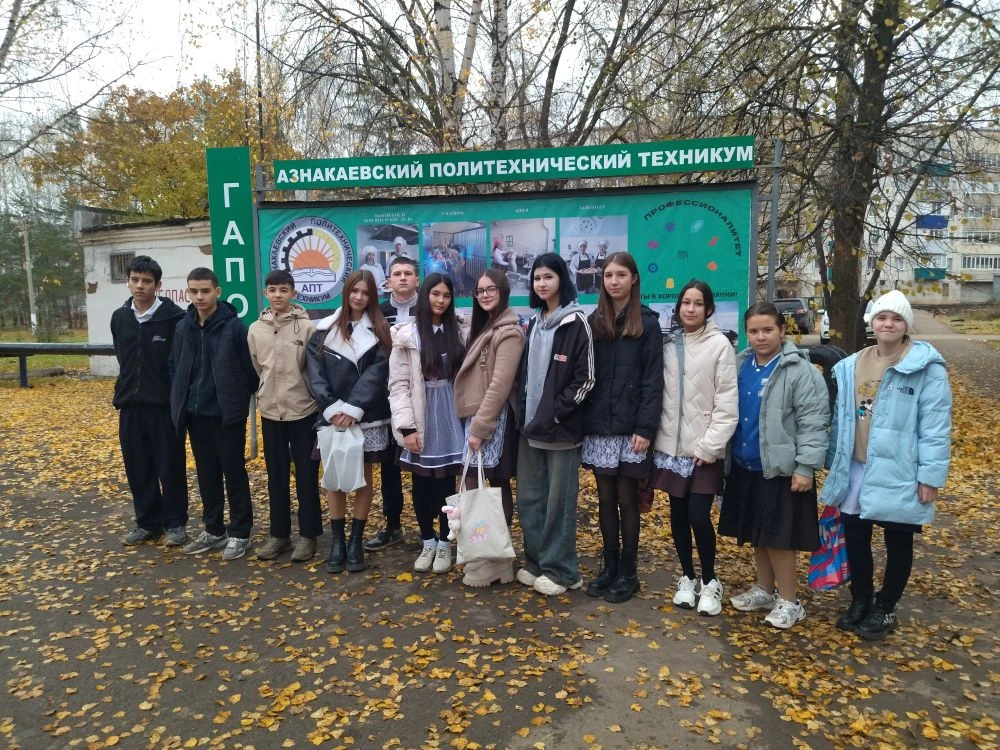 Бүген, һөнәри юнәлеш бирү кысаларында, 9 класс укучылары "Азнакай политехник техникумы" дәүләт автоном һөнәри белем бирү учреждениесендә булдылар. Әлеге чара мәктәп укучыларын төбәкнең хезмәт базарында ихтыяҗ булган урта звено белгечләре һәм квалификацияле эшчеләр әзерләү юнәлешләре белән таныштыру максатында оештырылды. Экскурсия укыту-җитештерү остаханәләрендә, заманча җиһазландырылган лабораторияләрдә булуны, шулай ук техникум укытучылары һәм студентлары белән очрашуны үз эченә алды. Татарстан Республикасы Мәгариф һәм фән министрлыгы мәгълүматларына караганда, мондый чаралар киләчәктә һөнәр сайлауга һәм гомуми белем мәктәпләрен тәмамлаучыларны һөнәри белем бирү системасына интеграцияләүгә ярдәм итә.