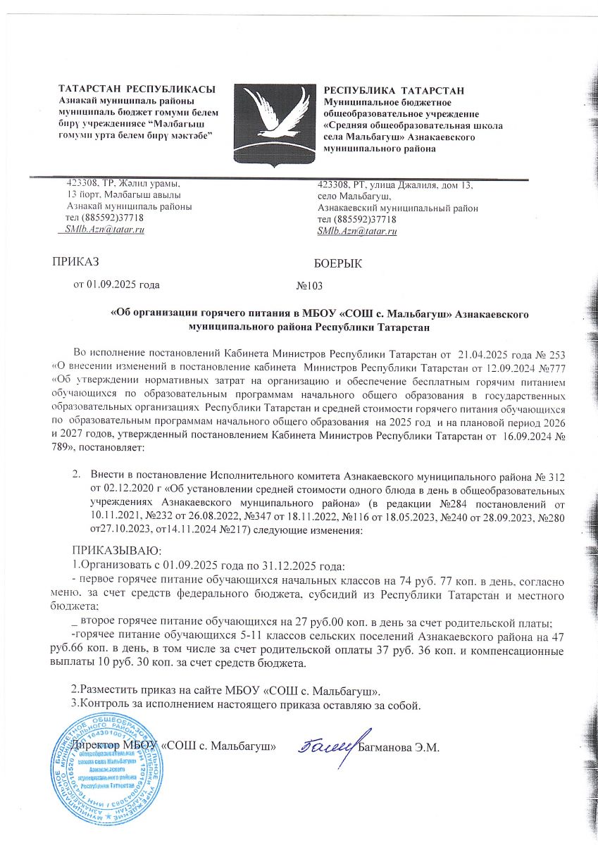 Приказ об организации горячего питания в МБОУ "СОШ с.Мальбагуш"