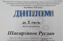 Ученик 9 класса Шакирзянов Руслан принял участие региональном этапе Всероссийской конференции "Юные техники и изобретатели в Государственной Думе Федерального собрания РФ "Ежегодная республиканская олимпиада юных изобретателей" "Кулибины XXI века" и занял 2 место. Руководитель Шайдуллин Р.Р. награжден грамотой за подготовку финалиста. Поздравляем!!!