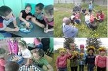 Сегодня день был прекрасным. Научились вить венки из одуванчиков, разгадывали загадки, поиграли в настольные игры, готовили флешмоб.