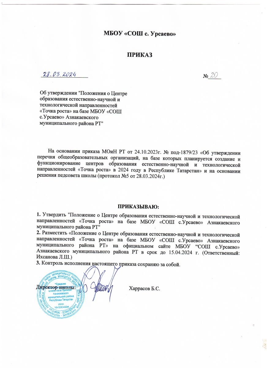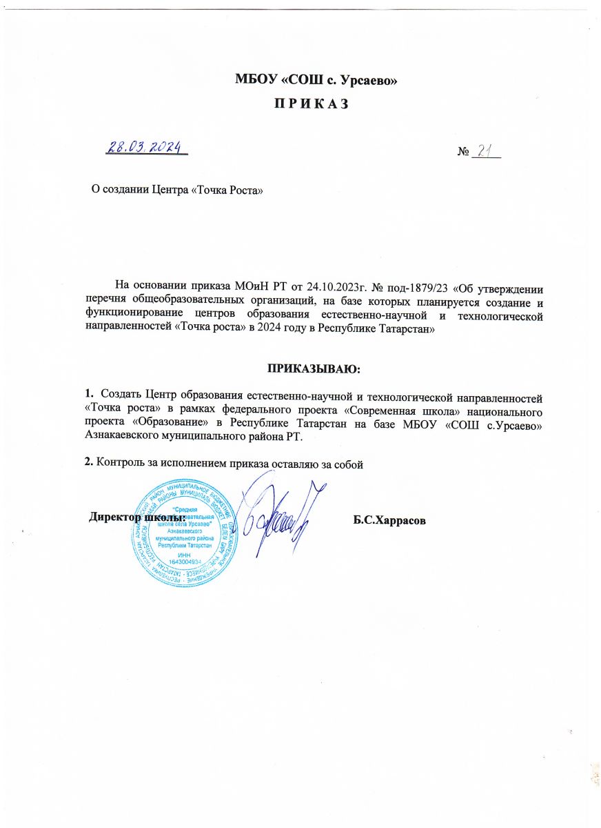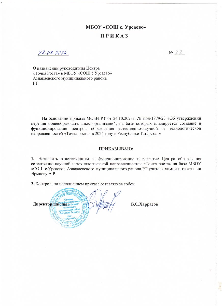 Приказ о назначении руководителя Центра "Точка роста"