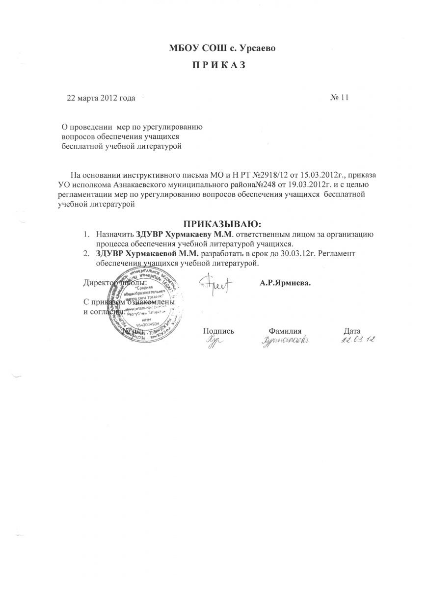 Приказ о проведении мер по урегулированию вопросов обеспечения учащихся бесплатной учебной литературой.