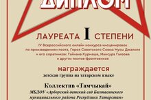 Бакчабызның "Тамчыкай" коллективы IV Ботенроссия онлайн инсценировкалар кокурсында Муса Җәлилнең "Карак песи" шигырен сәхнәләштереп 1 дәрәҗә лауреват диломы белән бүләкләнделәр./ Творческий коллектив нашего детского сада "Тамчыкай" приняла участие в IV Всероссийском онлайн конкурсе инсценировок по произведениям Героя Советского Союза Мусы Джалиля и его соратников и стала лауреатом 1 степени.