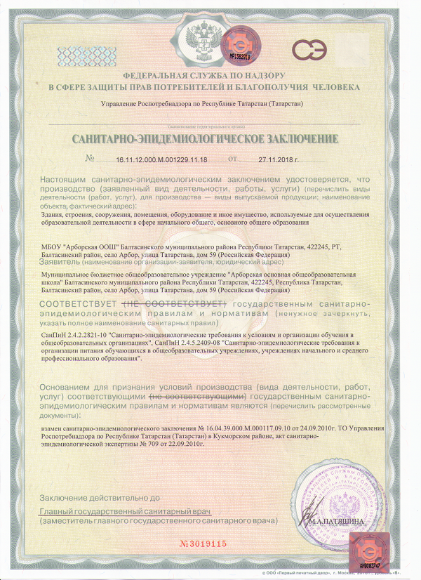 Санитарно-эпидемиологическое заключение для МБОУ "Арборская ООШ"