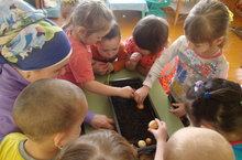 Уртанчылар һәм кечкенәләр төркемендә тәрбияләнүче балалар бергәләшеп суган утырттылар.