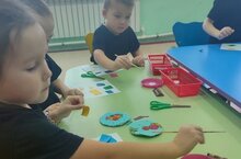 Дети средней группы на занятии по аппликации, закрепил умение резать полоску бумаги по прямой,квадрат по диагонали,старались работу выполнить аккуратно.