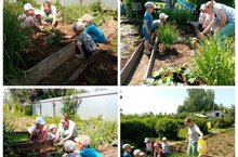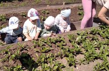 Кечкенәләр төркеме балалары тәҗрибә участогында тәрбияче белән берлектә су сиптеләр, түтәлдәге чүпләрне алдылар, кабакның үсүен күзәттеләр. Хезмәт күнекмәләре бирү ныгытылды.