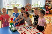 Сегодня воспитанники старшей группы вспомнили правила дорожного движения, дорожные знаки, повторили значение цветов светофора.