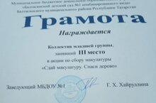 Макулатура җыюда катнашып зурлар төркеме 2 нче урынны яулап алды һәм грамота, уенчыклар белән бүләкләнде. Макулатура җыюда актив катнашкан әти-әниләргә чын күңелдән рәхмәтебезне белдерәбез.