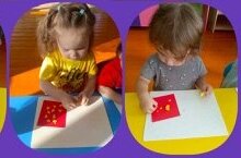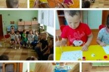 На занятии лепки сегодня с детьми отщипывали маленькие кусочки пластилина от большого куска,старались скатывать из них шарики и пальцем прикрепляли шарики к картонной основе.