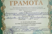Тәрбияче Акбирова Г.М. балаларга һөнәри юнәлеш бирүне оештыруда дидактик уеннар аша практик күнекмәләрне камилләштерү, тәҗрибә уртаклашу максатыннан Кукмара муниципаль районында узган укучылар һәм педагогларның "Туган җир сулышы" 4 Республика фәнни-практик конференциясендә катнашып 2 урын яулап ТР мәгариф һәм фән министрлыгының грамотасына лаек булды.