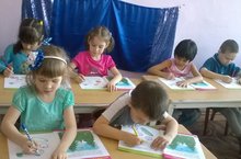 Рус теле шөгылендә зурлар төркеме балалары "Сад-огород" темасын кабатладылар. Балалар эш дәфтәрләрендә яратып эшлиләр.