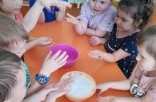 В младшей группе сегодня экспериментировали со снегом. Наблюдали, как он превращается в воду, растворяясь в тёплой воде и на батарее. Провели беседу о том, если на улице играть голыми руками, то руки мёрзнут, а в тепле не мёрзнут.