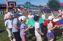 Зурлар төркеме балалары парашют белән төрле кызыклы уеннар уйнадылар. / Дети старшей группы поиграли в разные интересные игры с парашютом. 23.07.2025